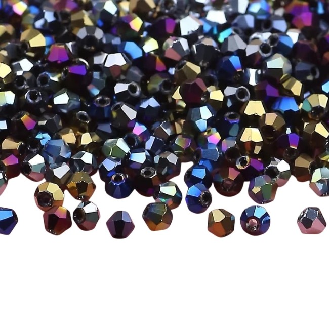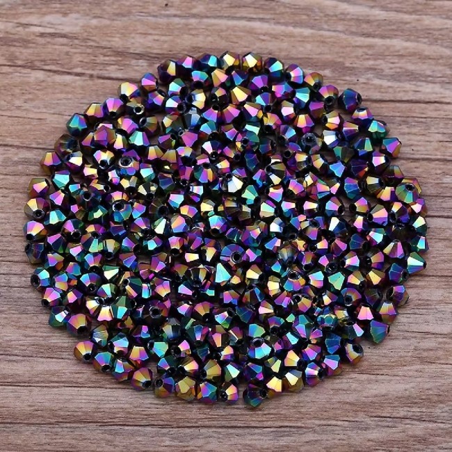 Sublimez vos bijoux avec nos perles toupies bicones de 6 mm. Ce modèle incontournable se distingue par sa base noire profonde, rehaussée d'une finition AB (Aurore Boréale). Résultat ? Une pluie de reflets multicolores qui évoluent selon la lumière, offrant un rendu luxueux et dynamique à toutes vos pièces.
